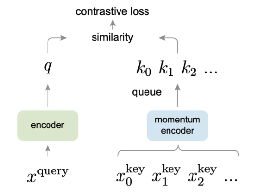 - contrastive loss는 $q$가 $k_+$와 유사도가 높고 나머지 key와는 유사도가 낮을 때 작은 값을 가짐.
