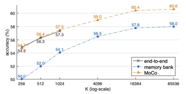 - dictionary 크기를 mini batch size와 분리 → dictionary 크게 유지