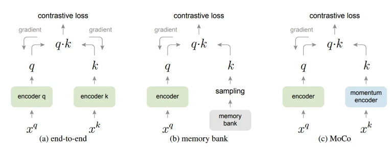 - memory bank에 모든 샘플들의 representation을 넣어두고, memory bank에서 무작위로 샘플링해서 key로 사용