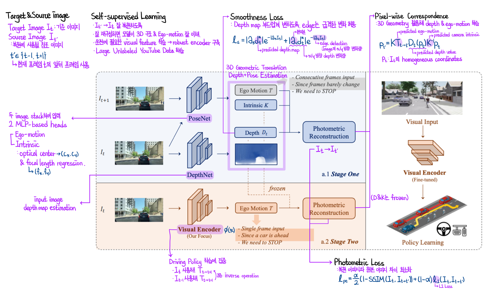 - 3D 기하학적 모델링을 활용한 Visual Encoder 학습으로 운전 정책 정보 학습 강화
