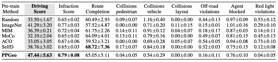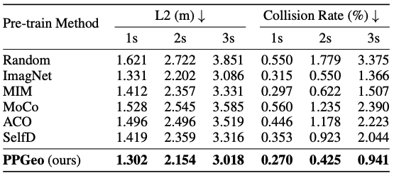 - PPGeo 기반 경로 계획 모델이 가장 낮은 충돌률을 기록