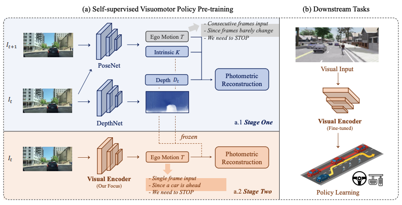 - visual encoder가 현재 시각적 관찰만을 기반으로 미래의 ego-motion을 예측하고, photometric error를 최적화함으로써 주행 정책 표현을 학습한다.