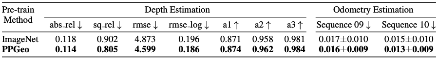 PPGeo의 stage 1 학습이 Depth Estimation & Odometry Estimation에도 효과적인지 검증
