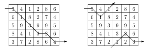 Problems that require minimum paths through some domain appear in many different areas of computer science. For example, one of the constraints in VLSI routing problems is minimizing wire length. The Traveling Salesperson Problem (TSP) — finding whether all the cities in a salesperson’s route can be visited exactly once with a specified limit on travel time — is one of the canonical examples of an NP-complete problem; solutions appear to require an inordinate amount of time to generate, but are simple to check. This problem deals with finding a minimal path through a grid of points while traveling only from left to right. Given an m×n matrix of integers, you are to write a program that computes a path of minimal weight. A path starts anywhere in column 1 (the first column) and consists of a sequence of steps terminating in column n (the last column). A step consists of traveling from column i to column i + 1 in an adjacent (horizontal or diagonal) row. The first and last rows (rows 1 and m) of a matrix are considered adjacent, i.e., the matrix “wraps” so that it represents a horizontal cylinder. Legal steps are illustrated on the right. The weight of a path is the sum of the integers in each of the n cells of the matrix that are visited. For example, two slightly different 5×6 matrices are shown below (the only difference is the numbers in the bottom row). The minimal path is illustrated for each matrix. Note that the path for the matrix on the right takes advantage of the adjacency property of the first and last rows.